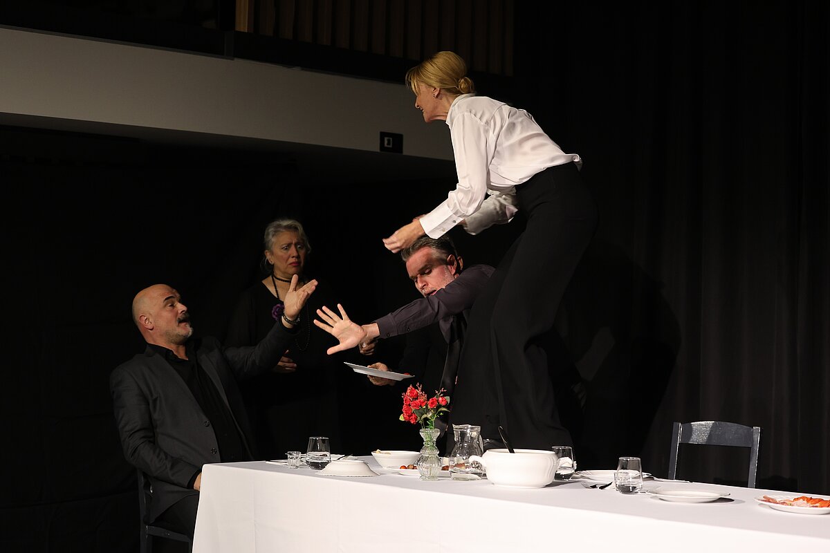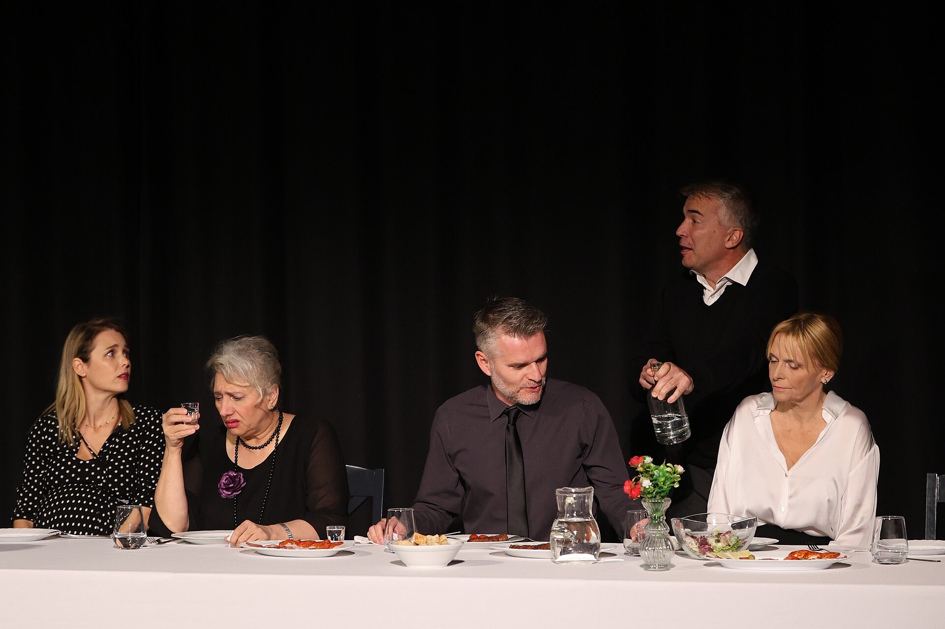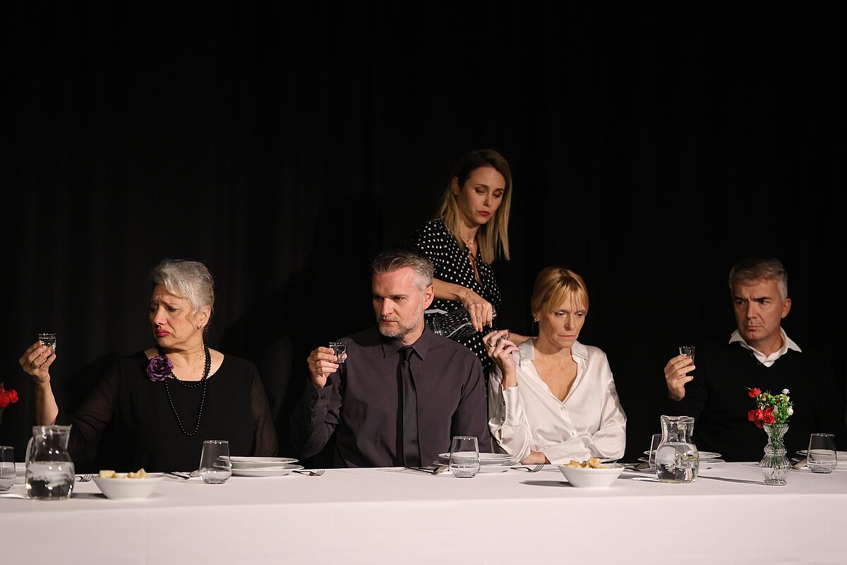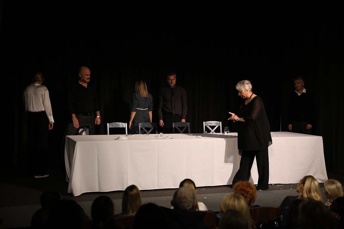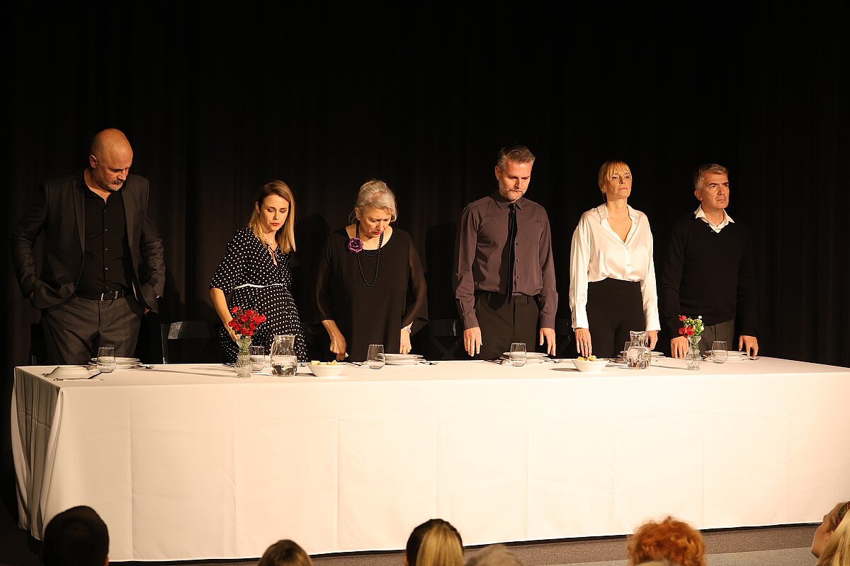 Глумачка постава — Гордана Ђурђевић Димић, Ненад Пећинар, Јасмина Вечански Кујунџић, Бојана Ординачев, Бранислав Јерковић и Југослав Крајнов — кроз сценску присности отворили су врата једне породице која се, након пет година ћутања, поново окупља због смрти блиске особе. Сто, обичан комад намештаја, постала је њихова исповедаоница, ринг и огледало у којем се свако од ликова суочава с оним што је одавно потиснуо.