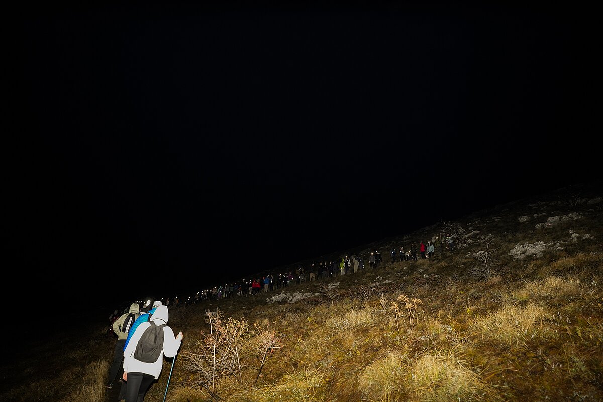 Камење и блато под ногама, непрестани успон од ког се губи дах и тама коју пресеца само непрегледна колона снопова светлости чеоних лампи, које се крећу у истом ритму попут свитаца у мраку. Звезде делују као да су надохват руке, али довољно далеке и недостижне да мотивишу учеснике да смогну још само мало снаге и издржљивости у покушају да им се бар мало приближе. Мистичну тишину прекидају само повремени уздаси умора, узвици упозорења на препреке на путу и шаљиве опаске којима планинарска екипа подиже морал у својим редовима.